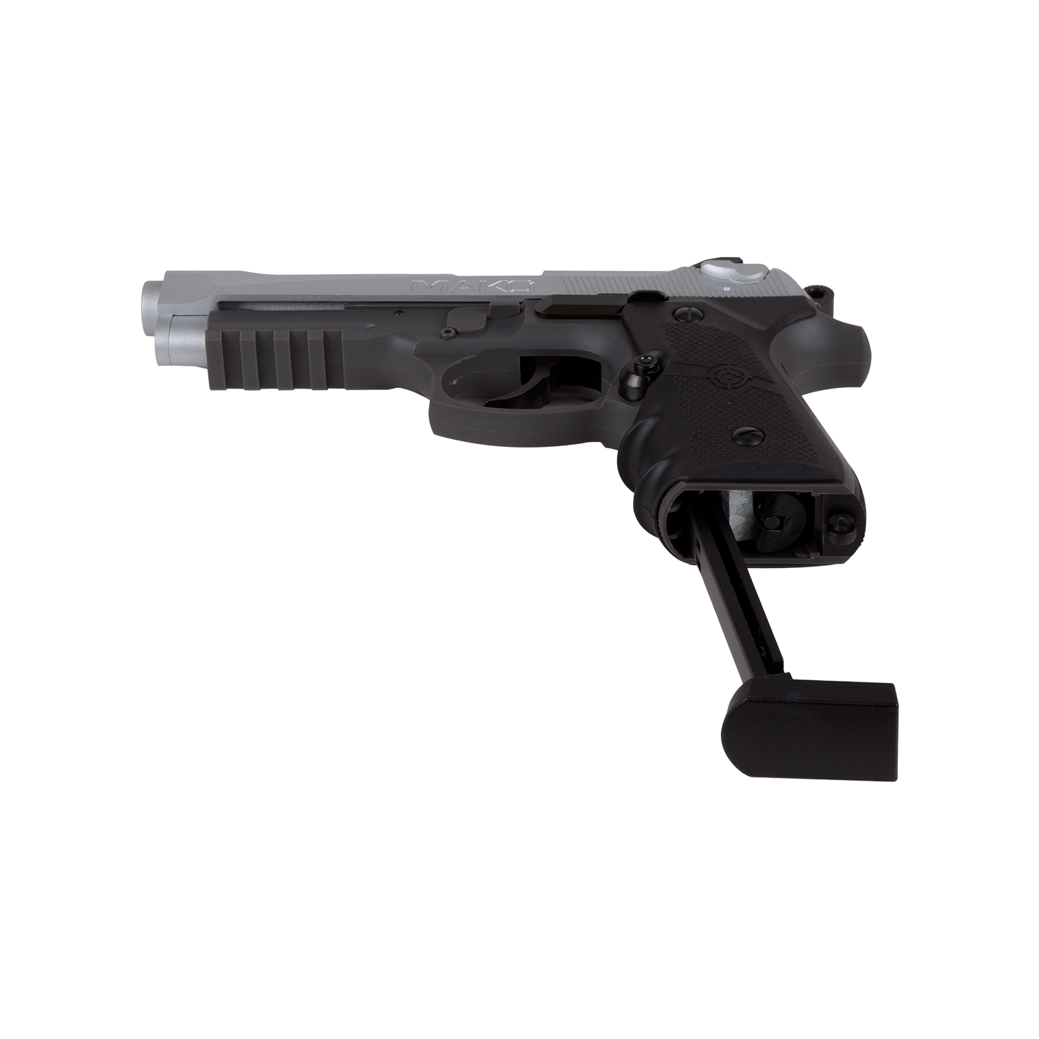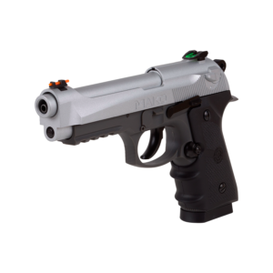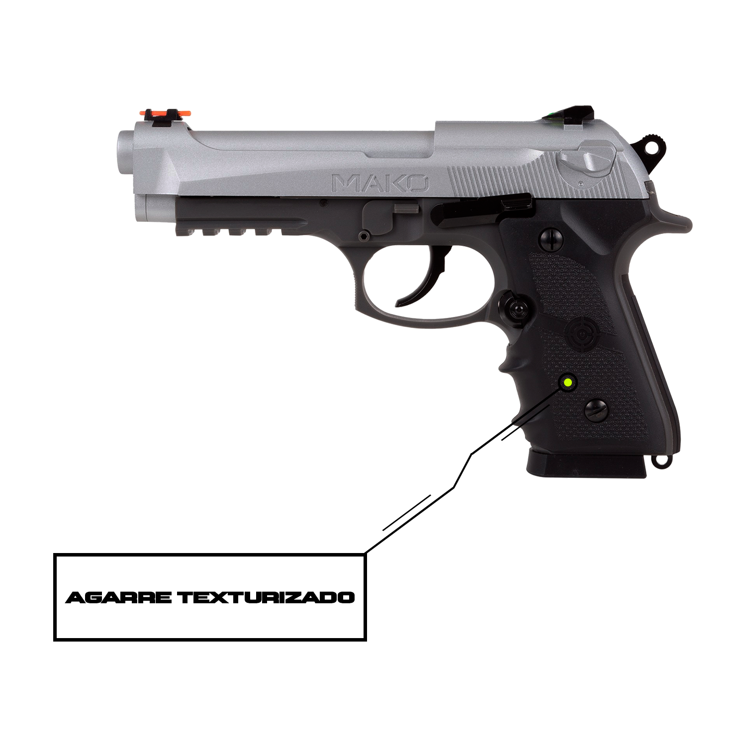 Alimentado por un solo cartucho de CO2 de 12 gramos, esta pistola de aire tipo Beretta presenta una revista número 20 de BB que lanza su carga útil de BB a velocidades de hasta 425 fps. Además del realismo del fuego semiautomático, se encuentra la acción de retroceso realista de la diapositiva de metal completo. Las miras fijas de fibra óptica de Mako aseguran una visión rápida de los objetivos. Como una ventaja adicional, el riel accesorio Picatinny / Weaver incorporado le da la opción de montar una mira láser o linterna para mayor precisión táctica. Si quieres una acción semiautomática asequible, ¡sumérgete en el Crosman Mako!