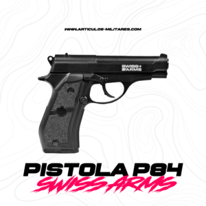 La Pistola de Aire CO2 Swiss Arms P84 estilo Beretta 84FS, hecha completamente de metal (full metal), dispara a una velocidad de 360 pies por segundo balines de acero calibre 4.5 mm.